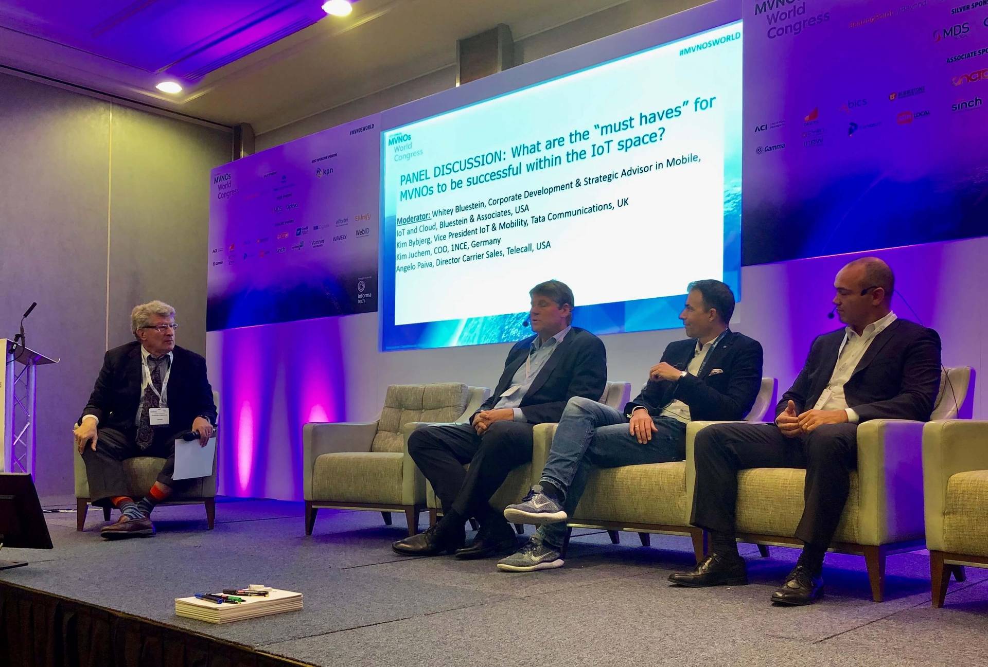 In the picture, the panel discussion that took place today morning - What are the “must haves” for MVNOs to be successful within the IoT space? Moderator: Whitey Bluestein, Corporate Development & Strategic Advisor in Mobile, IoT and Cloud, Bluestein & Associates, USA. Participants: Kim Bybjerg, Vice President IoT & Mobility, Tata Communications, UK. Kim Juchem, COO, 1NCE, Germany-. Angelo Paiva, Director Carrier Sales, Telecall, USA